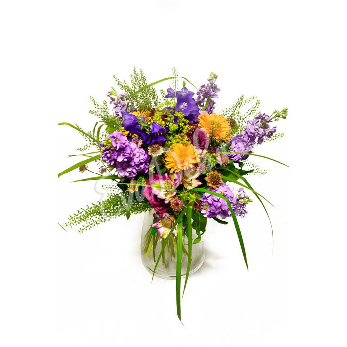 Letní fialy, germini, zvonky, alchemilla, alstroemeria, mix zeleně.