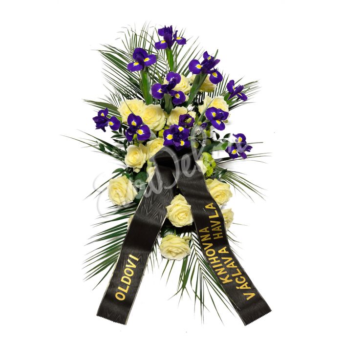 Modrý iris, růže avalanche, palma phoenix, mix zeleně, držák.
