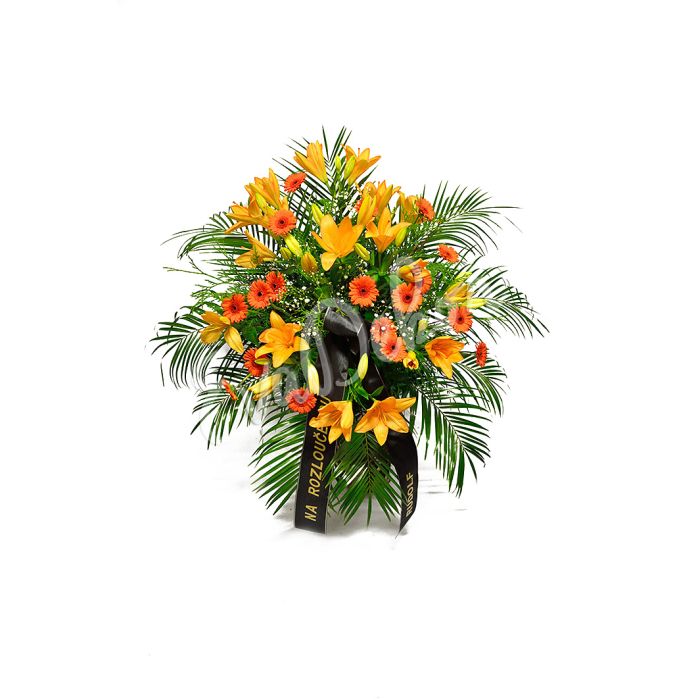 Oranžové lilie, oranžové gerbery, gypsophila, zeleň mix, držák.