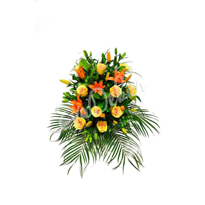 Oranžové lilie, oranžové růže, různé druhy zeleně, držák.