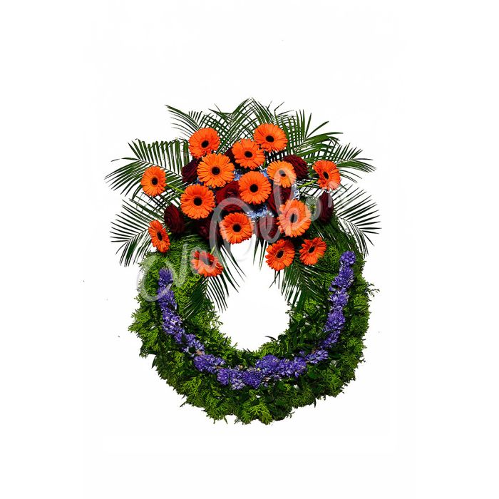 Gerbery oranžové, červené růže, modré hyacinty, zeleň mix, chvoj.