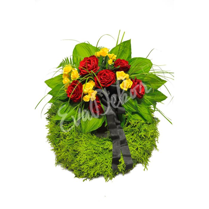 Červené růže, žluté růžičky, mix zeleně, chvoj.