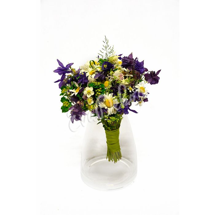 Kopretiny, orlíčky, alchemilla, květy jahody, zeleň.
