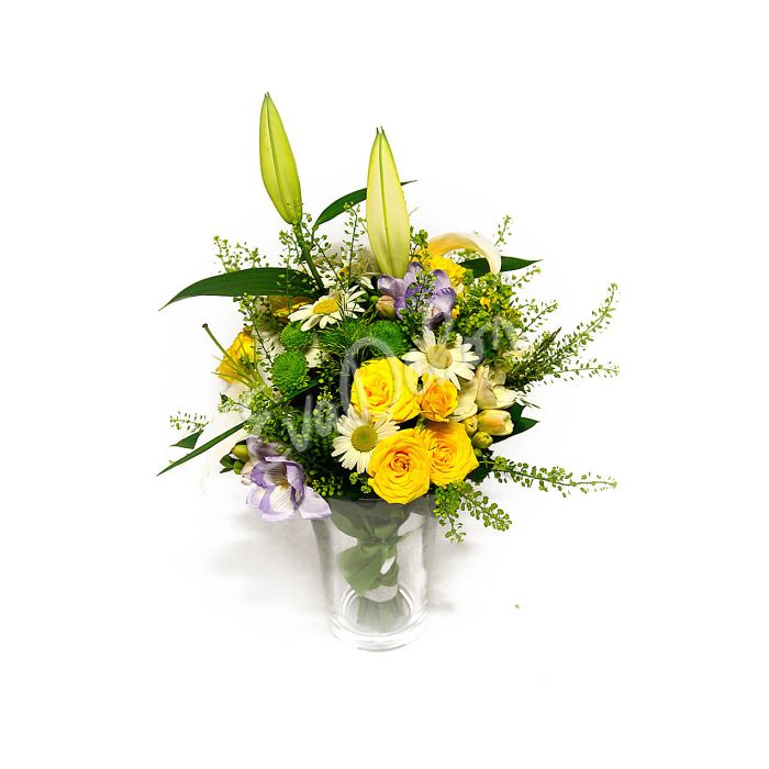 Lilie, kopretiny, růže žluté vícekvěté, frézie, penízky, různé druhy zeleně.
