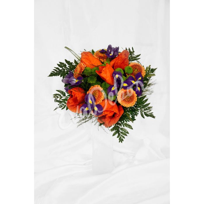 Vlčí máky, modré irisy, oranžové germini, zelené santini, mix zeleně