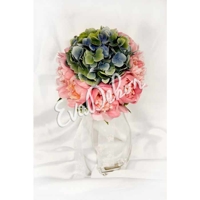 Růžové pivoňky, zelenomodrá hortenzie