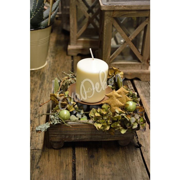 Svícen netradičně aranžovaný do čtvercové antik krabičky. Základ svícnu (krabička/box/obal) se může lišit od fotografie - dle nabídky v květinářství.