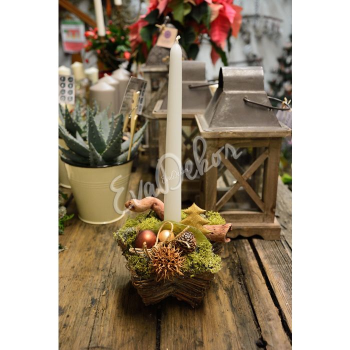 Svícen je aranžován do proutěného základu ve tvaru hvězdy, přírodně dozdoben.