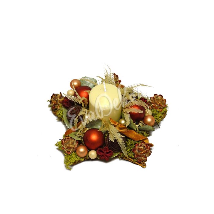 Svícen Hvězda je aranžován do nízké proutěné konstrukce ve tvaru hvězdy, bohatě dozdoben přírodním materiálem.